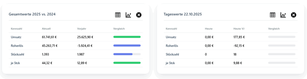 - Gesamt- & Tageswerte: Kompakte Tabellen, die Ihnen die wichtigsten KPIs (Umsatz, Roherlös, Stückzahl) für den gewählten Zeitraum und den heutigen Tag anzeigen – inklusive prozentualem Vergleich zum Vorjahr.