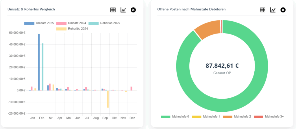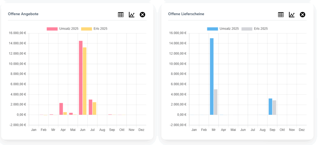 - Offene Angebote/Aufträge/Lieferscheine: Drei separate Diagramme, die den Wert und Erlös noch nicht abgeschlossener Angebote, Aufträge und Lieferscheine zeigen.