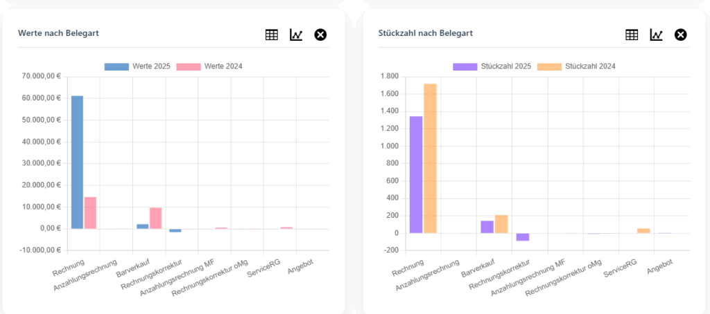 - Werte/Stückzahl nach Belegart: Analysiert, welche Belegarten (Rechnung, Gutschrift etc.) wie viel Umsatz oder Volumen erzeugen.