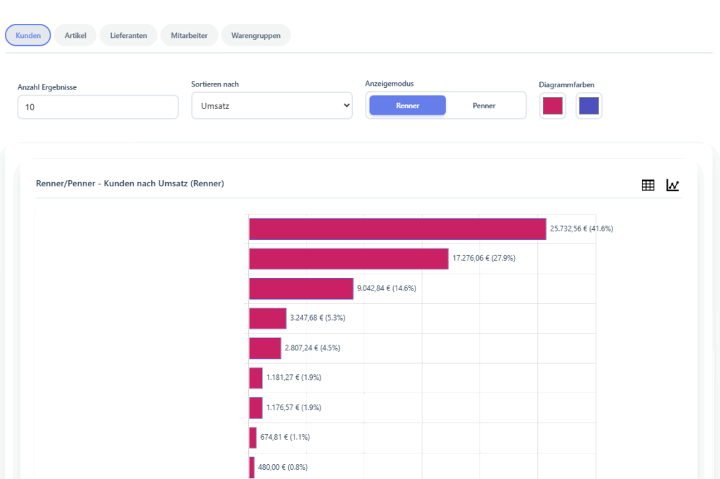 - Sortieren nach: Wählen Sie die Kennzahl (Umsatz, Roherlös, Stückzahl).