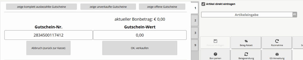 | 86/GutscheinNr | Verkauf des Gutscheins mit der angegebenen Gutscheinnummer (Gutscheinnummer muss min. 9 Zeichen enthalten) |