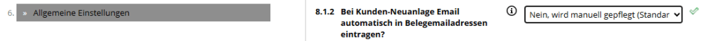 Standardmäßig ist die Einstellung auf Nein. Bei der Auswahl ja, wird die eingegebene Emailadresse bei Belegemailadressen für alle Belege eingetragen.