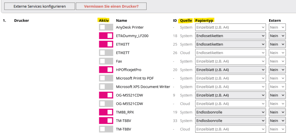 Die Funktionen sind je nach Aufruf schlau genug, Drucker nachträglich automatisch aktivieren und konfigurieren zu können, wenn diese angesprochen werden. Für einen zuverlässigen Betrieb der Drucker arbeiten Sie dies bitte trotzdem einmal manuell nach.